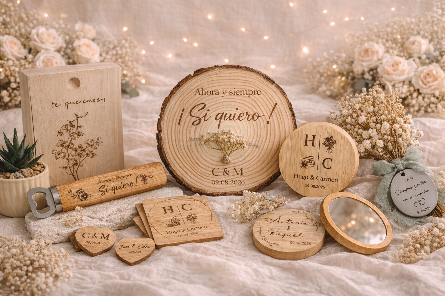 Ofrecemos un servicio exclusivo de personalización en directo durante la celebración, donde vuestros invitados reciben su regalo grabado al momento, creando un recuerdo único que forma parte del propio evento. Trabajamos con abridores, espejos, navajas multiusos, cepillos, marcapáginas y otros detalles cuidadosamente seleccionados.